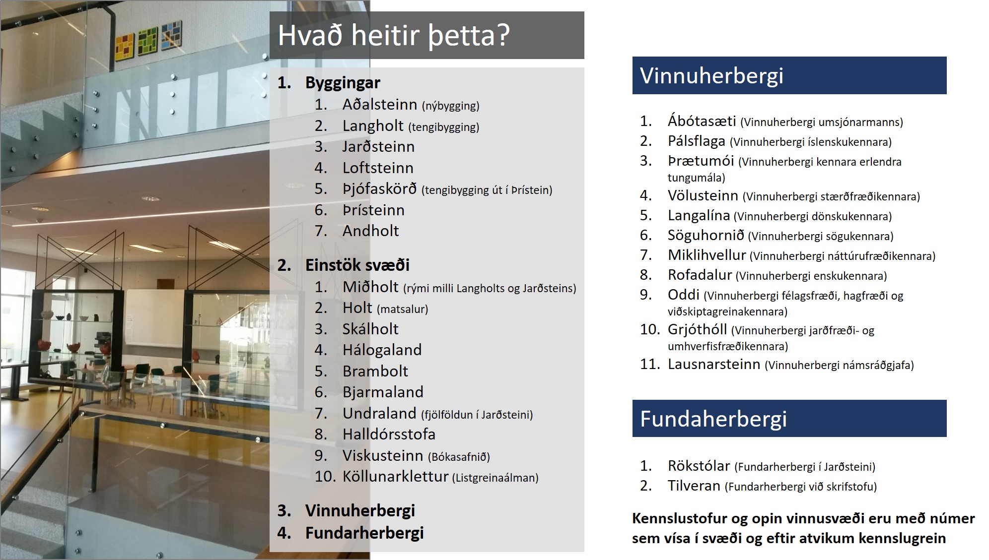 - Rökstólar: Er fundarherbergi fyrir 16-20 manns. Er í Jarðsteini.