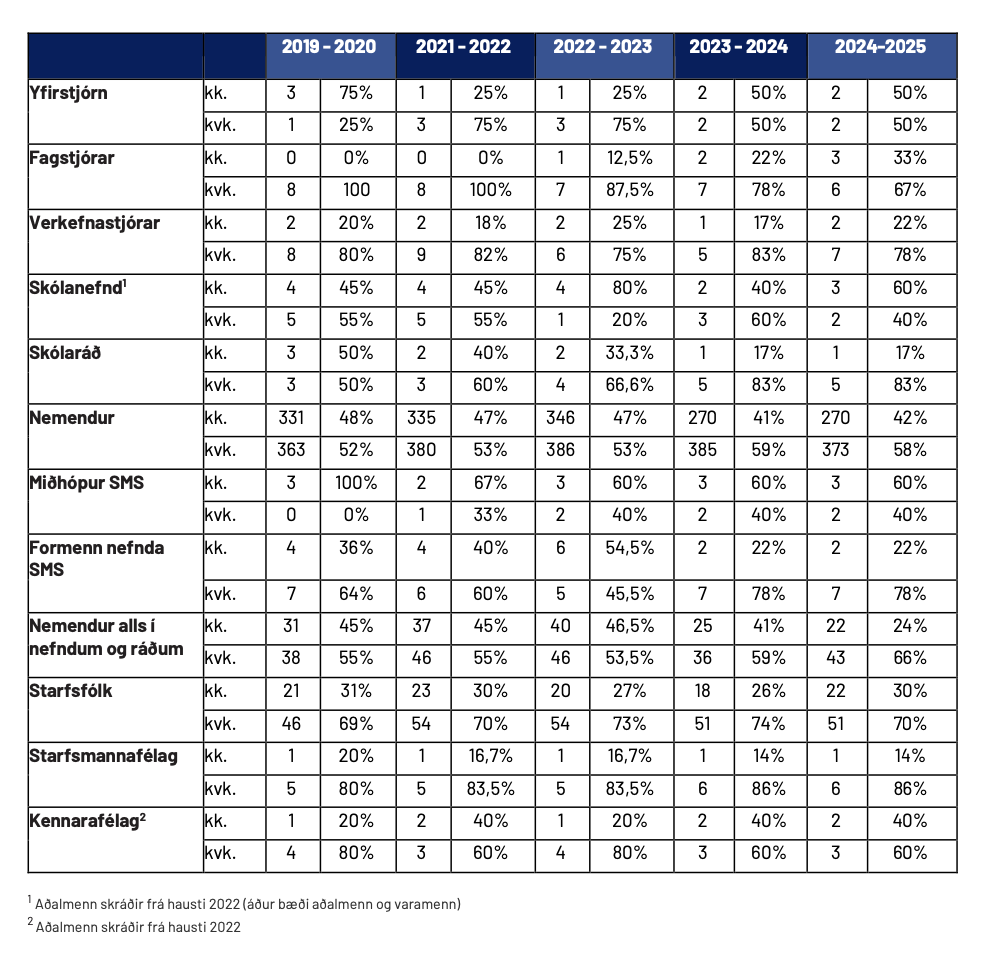 Jafnréttisvísar (tölfræði yfir starfsmenn, nemendur, nefndir og ráð í skólanum)