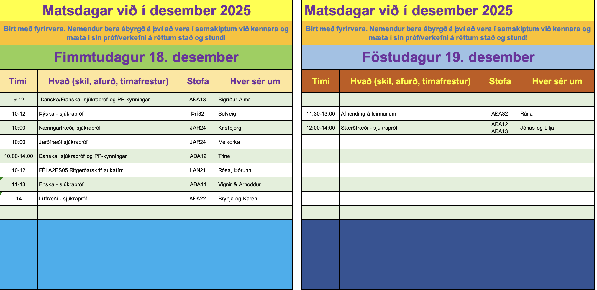 Fimmtudagurinn 18. desember og föstudagurinn 19. desember eru matsdagar í MS. Hér má sjá dagskrá matsdaganna: