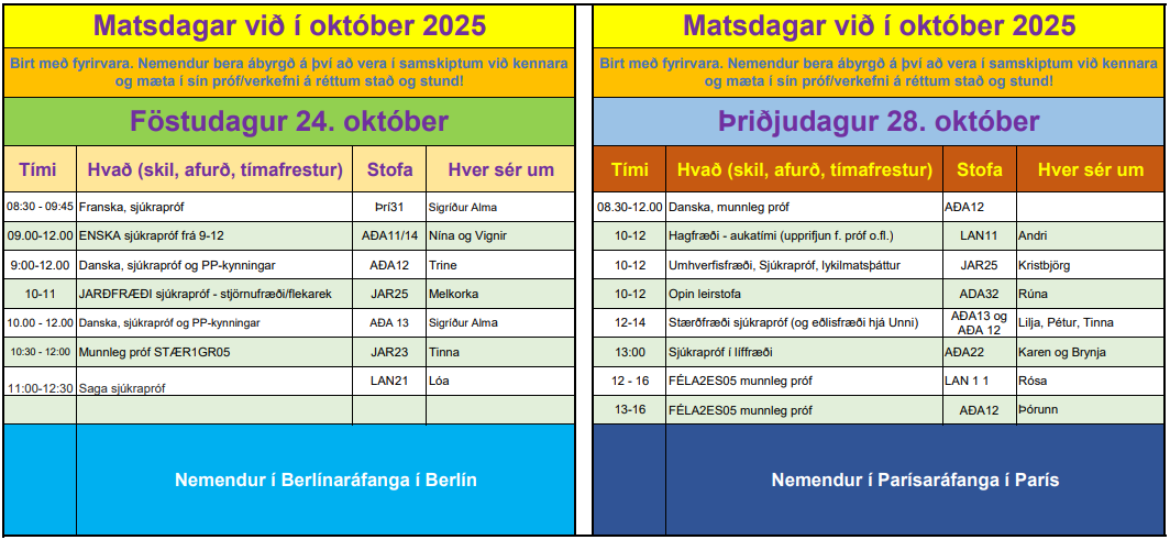 Haustfrí verður í MS mánudaginn 27. október. Í kringum þessa helgi eru einnig matsdagar, þ.e. föstudaginn 24. október og þriðjudaginn 28. október. Ekki er kennt samkvæmt stundaskrá þessa daga en nemendur geta verið kallaðir inn í verkefni eða próf. Dagskrá matsdaga má sjá hér á myndinni. Nemendur bera sjálfir ábyrgð á því að vera í sambandi við sína kennara varðandi verkefni og próf á matsdögum og mæta á réttum stað og stund.