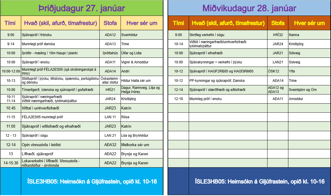 Matsdagar verða þriðjudaginn 27. janúar og miðvikudaginn 28. janúar. Dagskrá matsdaga má sjá á meðfylgjandi mynd og nemendur bera sjálfir ábyrgð á því að mæta í sín verkefni / próf á réttum stað og stund.