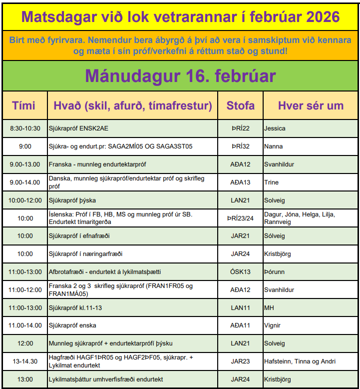 Í dag er síðasti kennsludagur vetrarannar. Í næstu viku eru matsdagar og dagskrá má sjá á myndinni hér fyrir neðan.