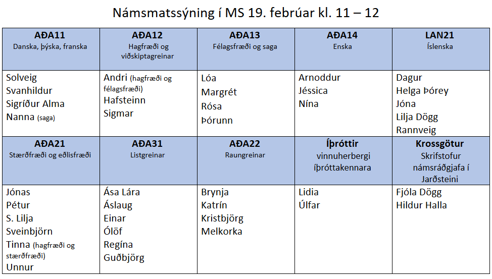 Nú er vetrarönn að ljúka og lokaeinkunnir áfanga hafa verið birtar í Innu. Námsmatssýning vetrarannar fer fram fimmtudaginn 19. febrúar. Á námsmatssýningu gefst nemendum tækifæri til þess að skoða námsmatið og gera athugasemdir. Fyrirkomulag námsmatssýningarinnar verður með tvenns konar móti: annars vegar í skólanum og hins vegar í gegnum TEAMS. Nemendur skulu því kynna sér upplýsingarnar hér mjög vel.