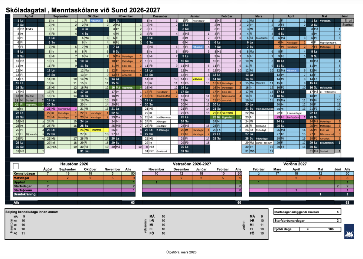 Skóladagatal Menntaskólans við Sund 2026-2027